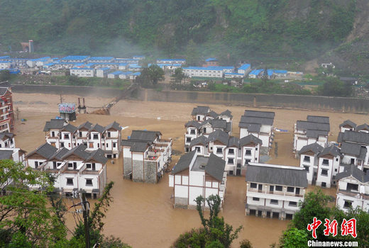 8月14日凌晨,連續(xù)強(qiáng)降雨引發(fā)汶川境內(nèi)映秀鎮(zhèn)、漩口鎮(zhèn)、銀杏鄉(xiāng)、三江鄉(xiāng)等鄉(xiāng)鎮(zhèn)發(fā)生多處泥石流災(zāi)害。圖為映秀地震后重建房屋被洪水侵襲 。中新社發(fā) 汶川新聞中心 供圖