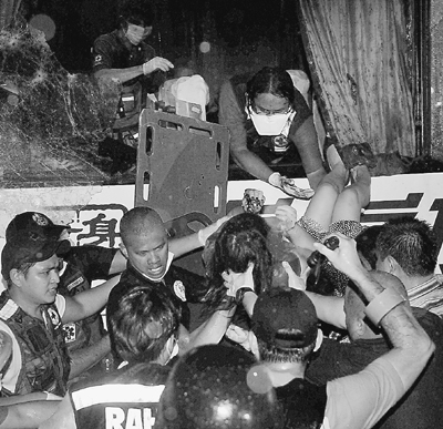 8月23日,在菲律賓首都馬尼拉,醫(yī)護(hù)人員將劫持事件中受傷的人員抬下客車。新華社發(fā)