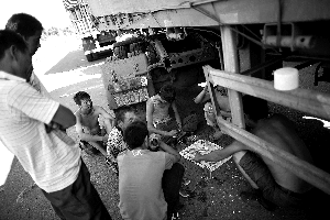 8月23日,京藏高速,被堵在郭磊莊入口的大貨車司機在車下打牌。王申 攝
