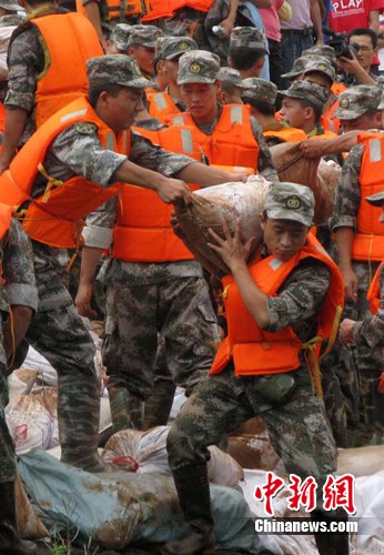 海南南渡江邊官兵們扛遞沙袋,排除險情。 朱文 攝