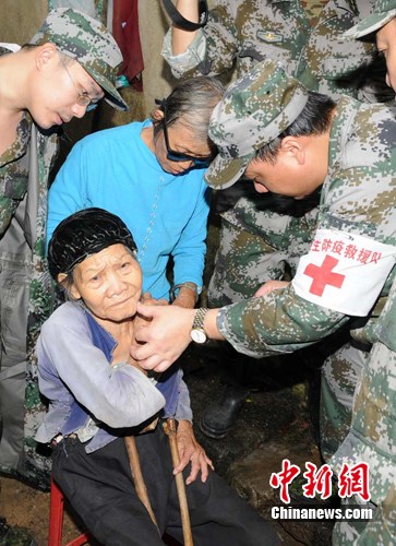 部隊醫護人員為受災群眾診治病情。 朱文 攝
