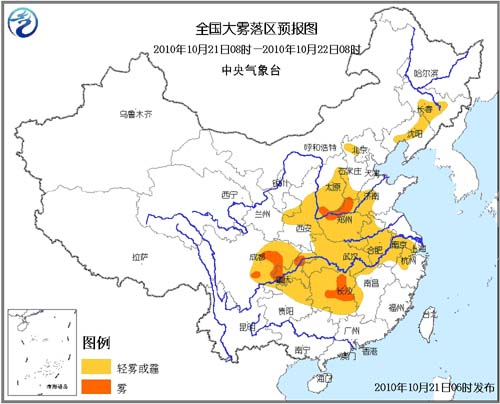 中央氣象臺10月21日06時繼續發布大霧藍色預警: