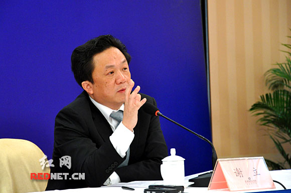 (湖南省環保廳副廳長、新聞發言人謝立在新聞發布會上回答記者提問。)