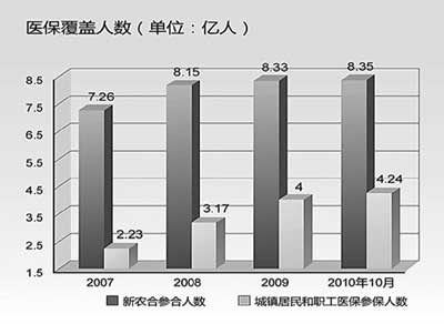 “看病難、看病貴”,是糾結在百姓心頭的突出問題。作為醫改三年重點實施方案的第二年,2010年承前啟后。沿著強基層這一方向,今年醫療體制改革繼續攻堅克難。社會保障是民生之基,今年10月,歷經多次討論修改的《社會保險法》正式發布,首次明確“基本養老保險全國統籌”、“養老及醫療保險實現異地漫游”等目標,給百姓吃了一顆定心丸。截至9月底,我國城鎮職工養老保險、城鎮醫療保險、失業保險、工傷保險、生育保險分別達到25025萬人、42072萬人、13147萬人、15871萬人、11973萬人,均超額完成 “十一五”規劃確定的指標任務。