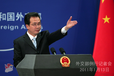 2011年1月13日,外交部發言人洪磊主持例行記者會。