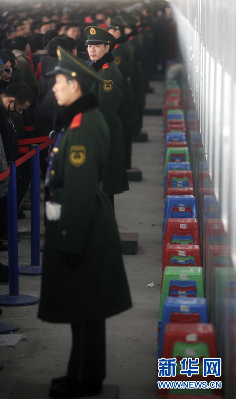 這是1月19日在鐵路上海站春運(yùn)售票“大賣場(chǎng)”拍攝的售票窗口前擺放的板凳。當(dāng)日是2011年春運(yùn)首日,鐵路上海站春運(yùn)售票“大賣場(chǎng)”在每個(gè)售票窗口前加設(shè)板凳,使旅客能坐著買票,免受彎腰低頭之累。 新華社發(fā)