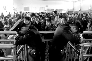 前日,春運(yùn)第三天,浙江嘉興火車站,負(fù)責(zé)執(zhí)勤的武警戰(zhàn)士利用檢票間隙趴在護(hù)欄上打盹小憩。車站說武警體力消耗非常大。嘉興日?qǐng)?bào)