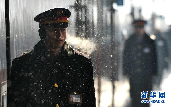 1月19日,在哈爾濱火車站的站臺(tái)上,列車員李福生在雪中堅(jiān)守崗位。當(dāng)日,2011年鐵路春運(yùn)正式啟動(dòng)。在哈爾濱火車站,許許多多的鐵路工作人員在寒風(fēng)中堅(jiān)守職責(zé),為乘客送去溫暖,為春運(yùn)提供保障。新華社記者王建威攝