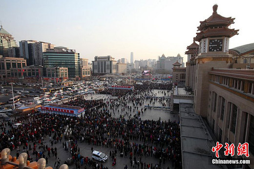 資料圖:1月22日上午,2011年春運離京客流高峰1月31日(臘月二十八)的D、Z、L字頭列車票發售,北京站、北京西站、北京南站均出現大規模排隊購票的情況。30分鐘內,所有始發列車座票和臥鋪票均告售罄。樊甲山 攝