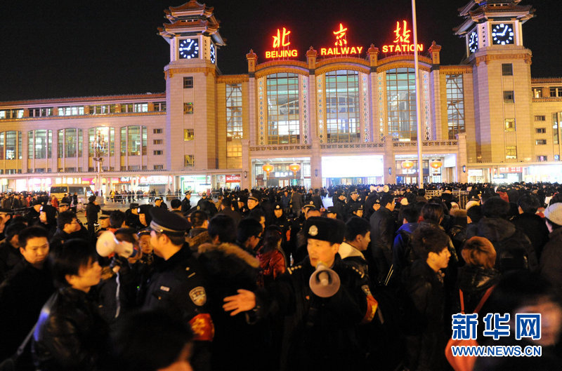 這是1月30日晚,北京鐵警在北京站廣場全力維持進站秩序。從1月28日晚起,北京站和北京西站、北京南站和北京北站四大火車站迎來春運以來的出京客流最高峰,出京客流總數達到40多萬人次。北京鐵路警方2000多名警察在四大火車站加大安檢力度,全力維持秩序,以確保春運期間治安秩序的穩定和旅客生命財產的安全。新華社記者 唐召明攝