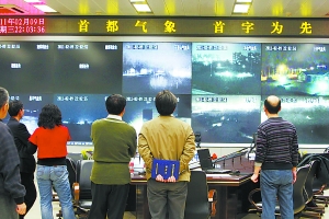 昨天21時30分 北京市氣象局辦公樓10層的天氣會商室里,燈火通明。大屏幕上,全市天氣云圖實時呈現(xiàn);電腦前,氣象專家和值班預(yù)報員目不轉(zhuǎn)睛地研究著多普勒雷達探測信息;氣象局領(lǐng)導(dǎo)坐鎮(zhèn)指揮,不時與前方觀測點進行通話。