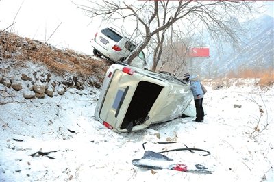 門(mén)頭溝忠良書(shū)院附近,兩輛車(chē)一掛樹(shù)一翻溝。本報(bào)記者王苡萱攝