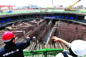9號線最大換乘站施工 在緊鄰六里橋客運樞紐的地鐵9號線六里橋站工地,目前國內最大的、直徑達到80米的圓形換乘大廳已初具規模,工人們正在緊張地進行站臺樓體結構施工! ”緢笥浾 孫戉攝