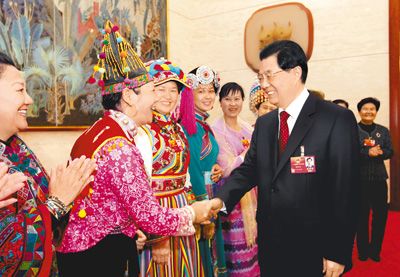 3月7日,中共中央總書記、國家主席、中央軍委主席胡錦濤參加十一屆全國人大五次會議云南代表團審議。胡錦濤首先來到女代表中間,同她們親切交談,代表黨中央向參加兩會的女代表、女委員和女工作人員,向全國各族各界婦女同胞致以誠摯的祝福和節日的問候。新華社記者 劉衛兵攝