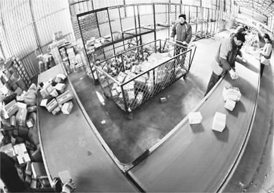 河北秦皇島海港區臨港物流園區一家快遞公司內,快遞員正在分揀快遞包裹。