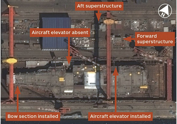 《簡氏防務周刊》認為,這些大型模塊的存在,可證明航艦的組裝將于近期內完成。