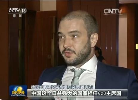 德國發展研究院 高級研究員雅克布:讓中國這個日益強大的國家擔任G20主席國是一件非常好的事,我們也將看到杭州峰會的討論成果,我對此抱有很大的期待。