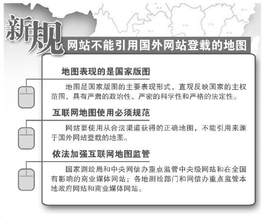 兩部門要求,各互聯網服務單位要嚴格按照《測繪法》、《地圖管理條例》等法律法規進行地圖審核和登載使用。地圖在登載前應依法送審,不得在地圖上標注涉密信息或者違反我國民族政策及政治主張的內容。