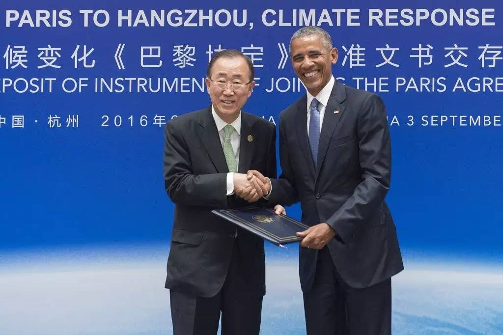 9月3日下午,國家主席習近平同美國總統奧巴馬、聯合國秘書長潘基文在杭州共同出席氣候變化《巴黎協定》批準文書交存儀式。習近平向潘基文交存中國氣候變化《巴黎協定》批準文書。