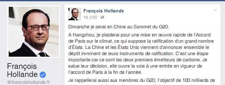 法國總統奧朗德在Facebook上發布信息稱,對中美兩國的決定表示歡迎。他認為,中美雙雙批準《巴黎協定》是“具有重要意義的一步”,為促進該協定在年底生效拓寬了道路。