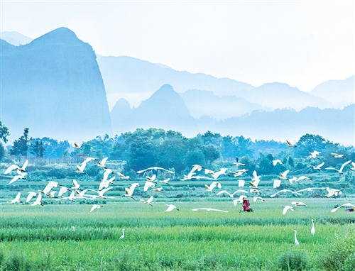 江西會昌縣周田鎮小田村,白鷺在田間飛舞。1934年10月紅九軍團1萬多人在會昌集結,踏上長征路。
