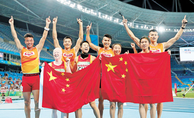 9月14日,里約殘奧會田徑女子4×100米T11—13級決賽,中國運動員奪得金牌后與領跑員一起慶祝。