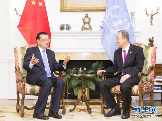 9月19日,國務院總理李克強在紐約會見聯合國秘書長潘基文。新華社記者 黃敬文 攝