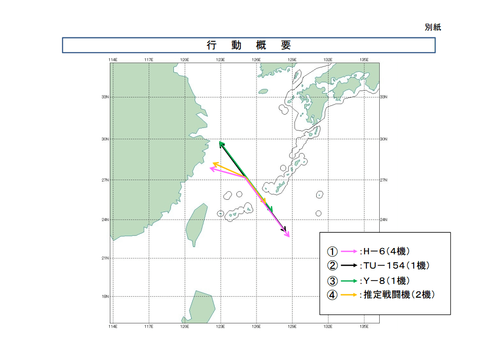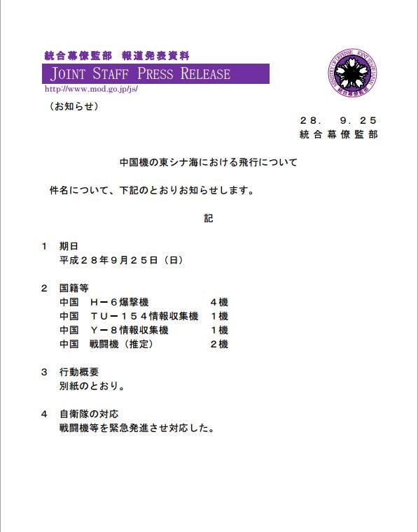 根據日本防衛省統合幕僚監部9月25日當天發布的公告顯示,25日當天共有8架中國軍機出現在東?沼。8架軍機分別為4架H-6戰略轟炸機、1架TU-154電子偵察機、1架Y-8偵察機。另外2架軍機據推斷可能是中國空軍戰機。