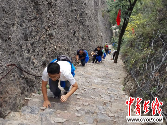 “走!走!別停下,停下就上不去了!”領隊在后面大喊著。采訪團一行人來到了陜西站的第一個紅色遺址——薛家寨革命舊址。1933年3月,劉志丹、習仲勛等帶著陜北紅軍到達銅川照金鎮,選中了這處懸崖峭壁作為自己的大本營。采訪團一行人面臨的就是一條近乎80°的陡峭山路。汗水浸濕了衣襟,這群年輕人手腳并用,經過一個多小時的攀登,終于抵達山頂!安挥H身體驗,很難想象老一輩革命家如何在簡陋的巖洞里指揮作戰,很難想象紅軍戰士如何在山路陡峭、一面是懸崖的大山中戰斗。”新華網記者馬若虎感慨道。