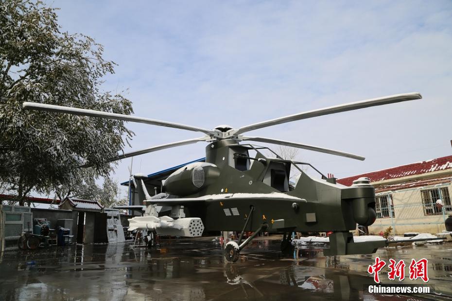 11月9日,在新疆呼圖壁縣絲路景逸雕塑廠房大院內,一架長達16米的直升機模型高顏值亮相。陶維明 攝