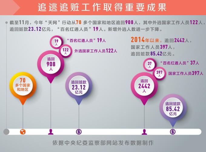 “截至11月,今年‘天網’行動共從70多個國家和地區追回908人,其中外逃國家工作人員122人,追回贓款23.12億元,‘百名紅通人員’19人。”12月9日,第13個“國際反腐敗日”到來之際,國家預防腐敗局副局長、中央紀委國際合作局局長劉建超接受采訪時表示,“中國正在以自身追逃追贓的實踐引領國際反腐敗執法合作。”