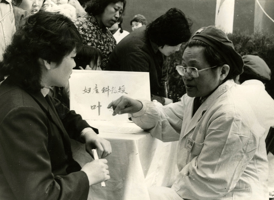 1980年義診時,葉惠方教授(右)為就診者講解(資料照片)。新華社發(fā)