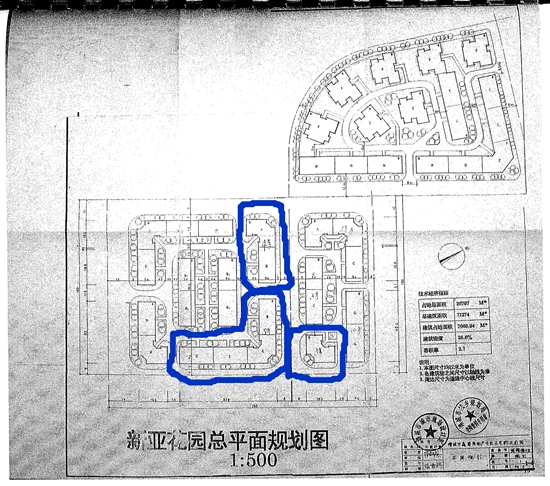 新亞花園總平面規(guī)劃圖中,藍(lán)色劃線內(nèi)為鑫蜀公司投資珠江學(xué)院3號、4號、5號樓共計3棟樓房的平面規(guī)劃圖