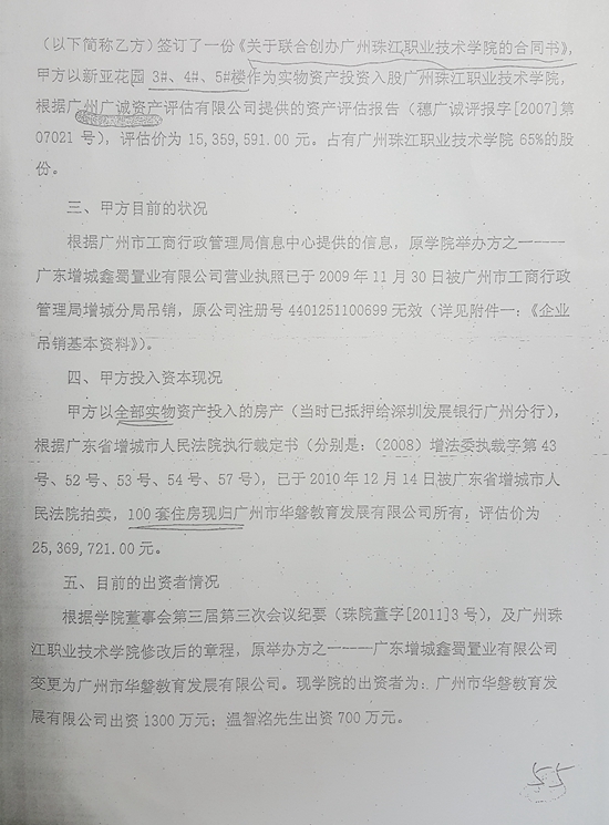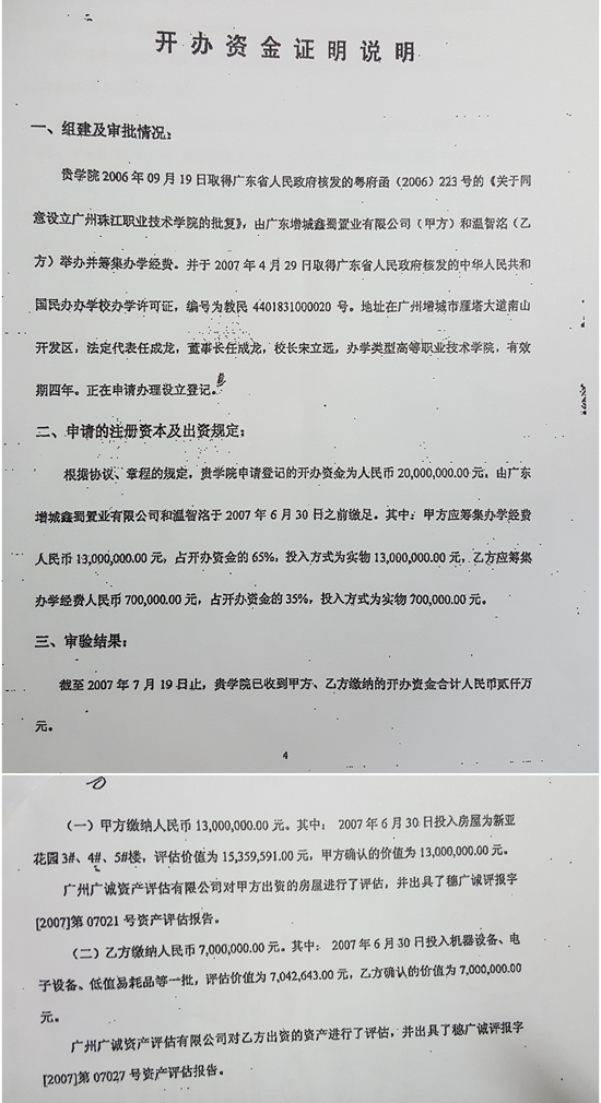 根據(jù)珠江學(xué)院章程規(guī)定,珠江學(xué)院開辦資金人民幣2000萬元。其中:鑫蜀公司出資1300萬元,占珠江學(xué)院65%的份額,出資方式為實物,即其自有的廣州增城市新亞花園3號樓、4號樓、5號樓共計3棟樓219套房產(chǎn),建筑面積12672.93平方米;溫智洺出資700萬元,占珠江學(xué)院35%的份額,出資方式為實物,即機(jī)器設(shè)備、電子設(shè)備等。除上述出資外,鑫蜀公司另將自有的新亞花園2號樓、10號樓共計2棟樓和近20畝土地投入給珠江學(xué)院使用至今,另出資現(xiàn)金數(shù)百萬元人民幣。