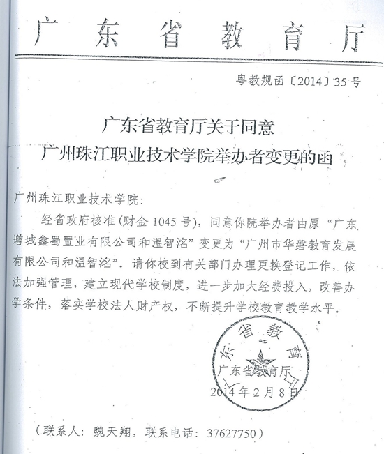 2016年6月20日,廣東省高級人民法院作出終審行政判決,撤銷廣州市中級人民法院一審行政判決,撤銷廣東省教育廳2014年2月8日作出的《廣東省教育廳關(guān)于同意廣州珠江職業(yè)技術(shù)學(xué)院舉辦者變更的函》。
