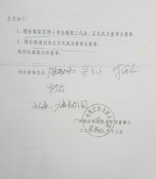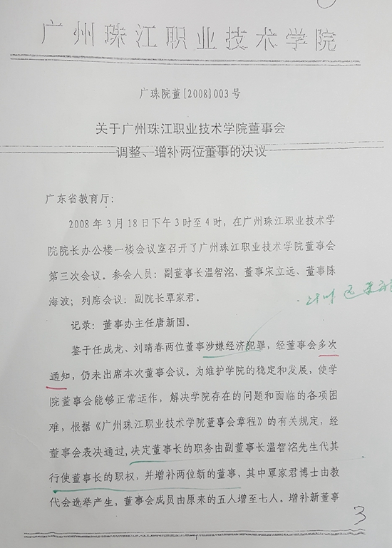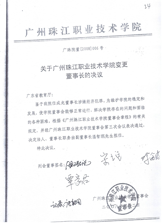 2008年4月2日,珠江學(xué)院董事會作出的廣珠院董(2008)006號《關(guān)于珠江學(xué)院變更董事長的決議》的內(nèi)容是:“經(jīng)珠江學(xué)院董事會第三次會議表決通過,決定法人、董事長職務(wù)由副董事長溫智洺先生擔(dān)任!背鱿瘯h董事簽名:溫智洺、宋立遠(yuǎn)、覃家君、陳海波。