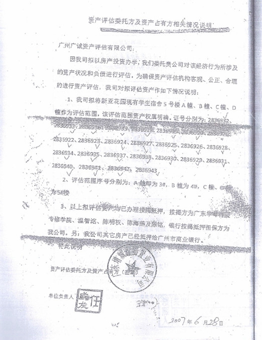 陳銘接受《法律與生活》雜志社記者采訪時說,廣東省教育廳、珠江學(xué)院、華磐公司不僅一直拿不出來落款日期為2007年6月28日、夾在《鑫蜀公司資產(chǎn)評估報告》中《情況說明》的原件,也拿不出《學(xué)院董事會決議》等相關(guān)文件的原件,“因為這些是虛假內(nèi)容的文件”。