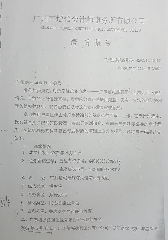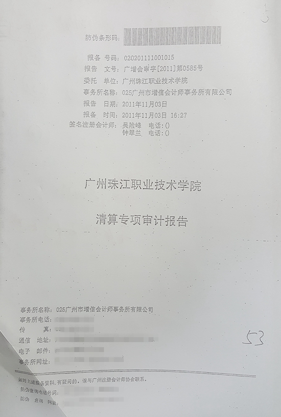 廣增會審字(2011)第0585號《珠江學(xué)院清算專項審計報告》