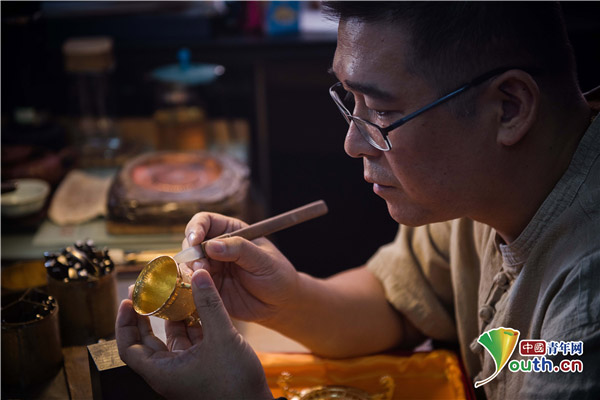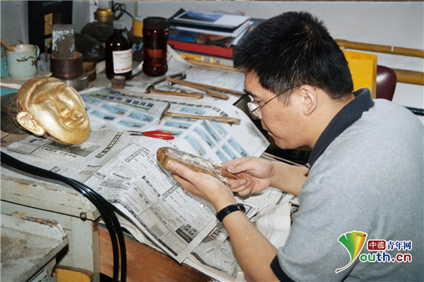 1987年,沈國(guó)興從老鳳祥辦的金銀飾品班畢業(yè),分配到遠(yuǎn)東飾品廠,以第一名的成績(jī)進(jìn)入了當(dāng)時(shí)技術(shù)能力最強(qiáng)的大件組。很多人說金銀擺件雖絢麗奪目,但雕刻金子的人卻是寂寞的,而沈國(guó)興這把鐵榔頭一敲就是30年!叭绻阆矚g這份工作,就會(huì)融入到當(dāng)中,班組一起工作很愉悅。榔頭每天要敲幾萬下,枯燥的時(shí)候可以聽聽音樂,自我調(diào)節(jié)。”沈國(guó)興說,“我很敬畏這門技藝,師傅把這門技藝毫無保留的傳給我,我也有這個(gè)責(zé)任好好的傳承下去!