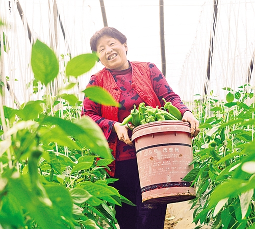 2月8日,山東茌平縣綠冠蔬菜合作社菜農搬運大青椒等菜蔬,以供應節日市場。