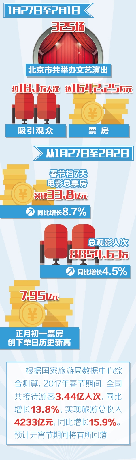 劇場演出成為新寵。1月27日至2月1日,北京市共舉辦文藝演出325場,吸引觀眾約18.1萬人次,票房達1642.25萬元。親子家庭類群體成為第二大文藝演出消費主體,占據春節期間北京演出觀眾總人數的17%,76場兒童劇演出共吸引3萬人次。