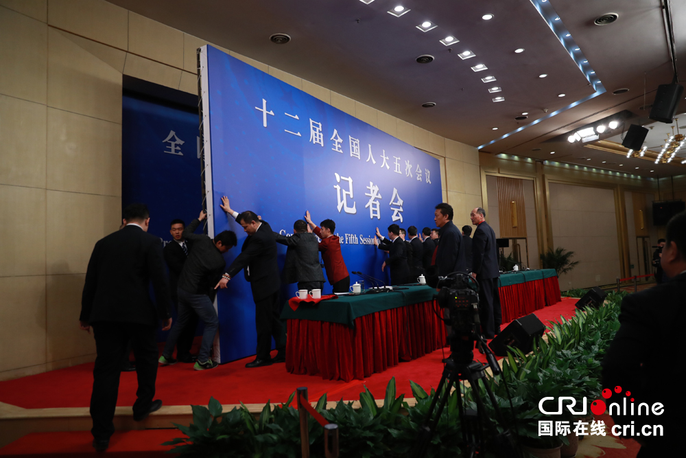 國際在線消息(記者 沈湜):2017年3月7日上午,十二屆全國人大五次會議新聞中心在梅地亞中心多功能廳舉行記者會,在上午的全國人大記者會結束后,新聞中心的工作人員馬上為下午舉行的全國政協新聞發布會更換背景板。