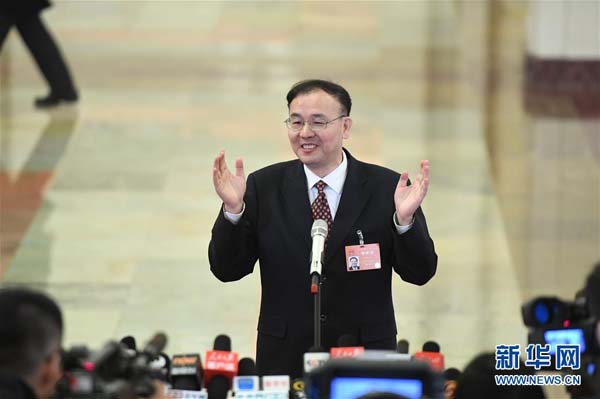 3月15日,第十二屆全國人民代表大會第五次會議在北京人民大會堂舉行閉幕會。這是國家郵政局局長馬軍勝接受采訪。 新華社記者 陳曄華 攝