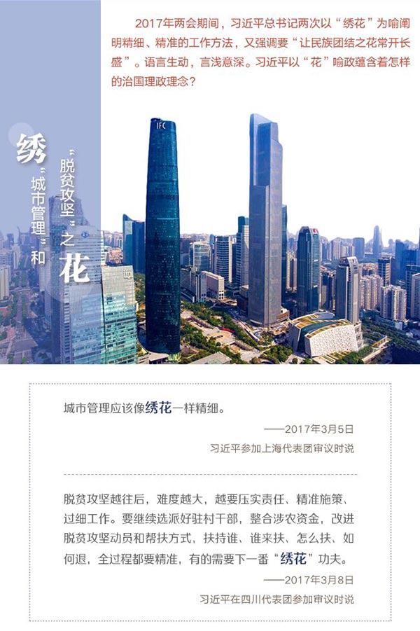 二繡脫貧攻堅:“全過程都要精準,有的需要下一番‘繡花’功夫。”3月8日,習近平在四川代表團談脫貧攻堅,再次以“繡花”為喻。