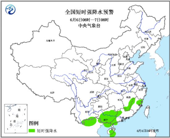 預(yù)計6月6日08時至7日08時,廣西中部和江西南部等地的局部地區(qū)有雷暴大風(fēng)或冰雹天氣;江西東南部、福建東北部、廣西大部、廣東北部和西部、云南東部和海南南部等地的部分地區(qū)有短時強降水天氣,小時雨量20-40毫米,局地可達(dá)70毫米。