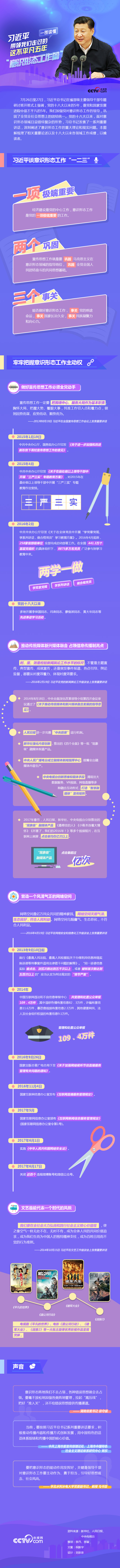 央視網消息:7月26日至27日,習近平在省部級主要領導干部專題研討班開班式上強調,黨的十八大以來的5年,是黨和國家發展進程中很不平凡的5年。我們加強黨對意識形態工作的領導,鞏固了全黨全社會思想上的團結統一。黨的十八大以來,面對意識形態領域日益錯綜復雜的形勢,習總書記發表了一系列重要講話,深刻闡述了意識形態工作的重大理論和現實問題。本圖解梳理了相關重要論述以及十八大以來各領域工作成績,以饗讀者。