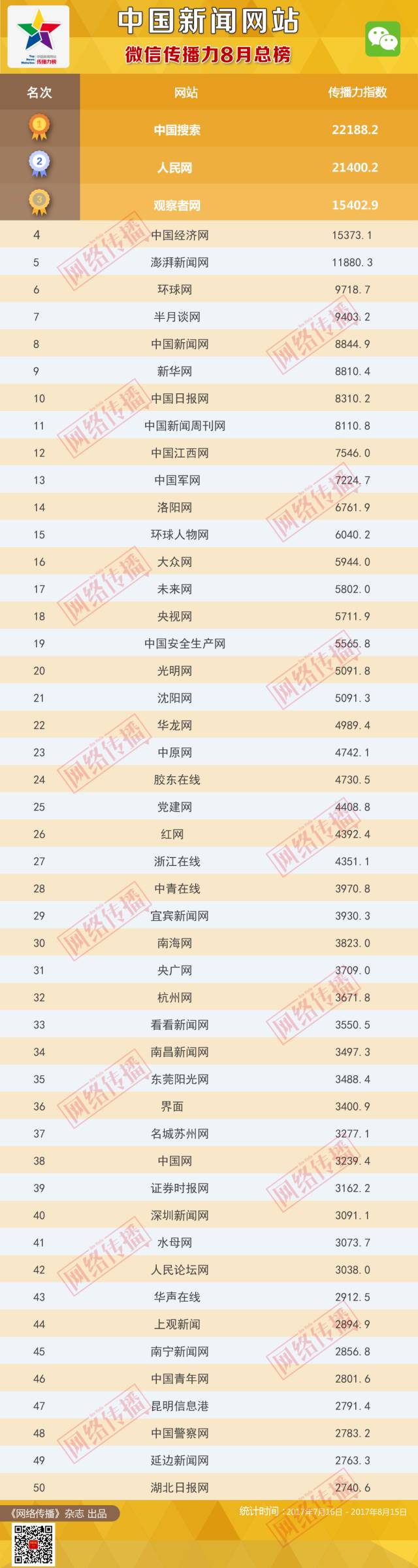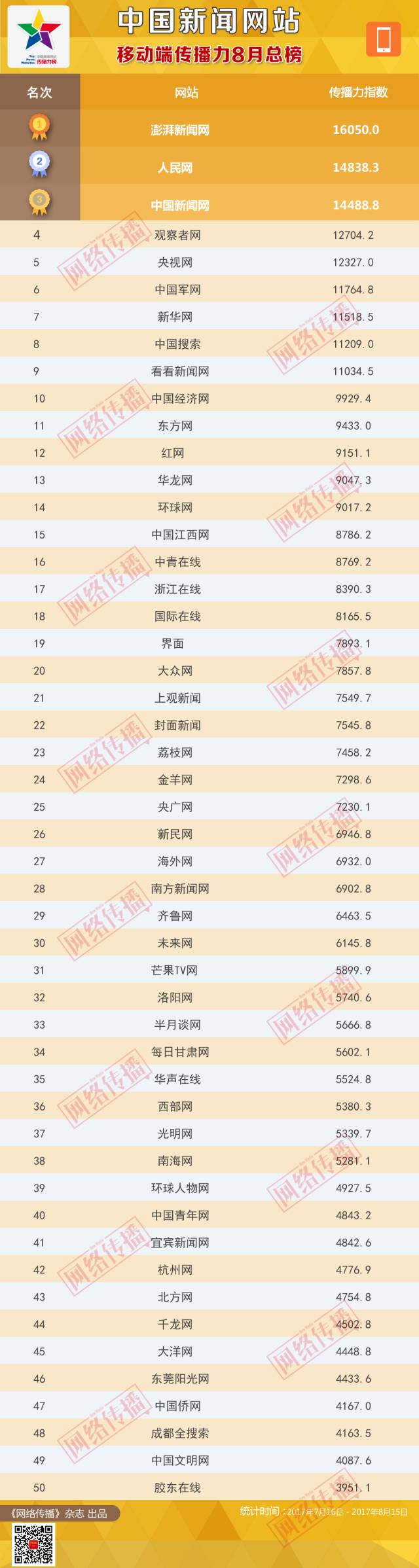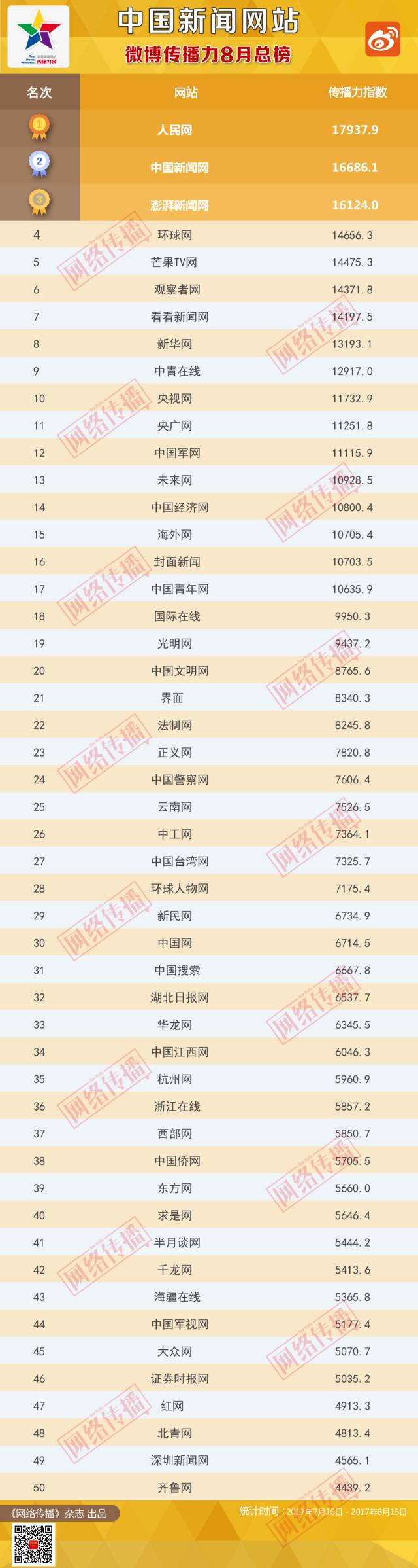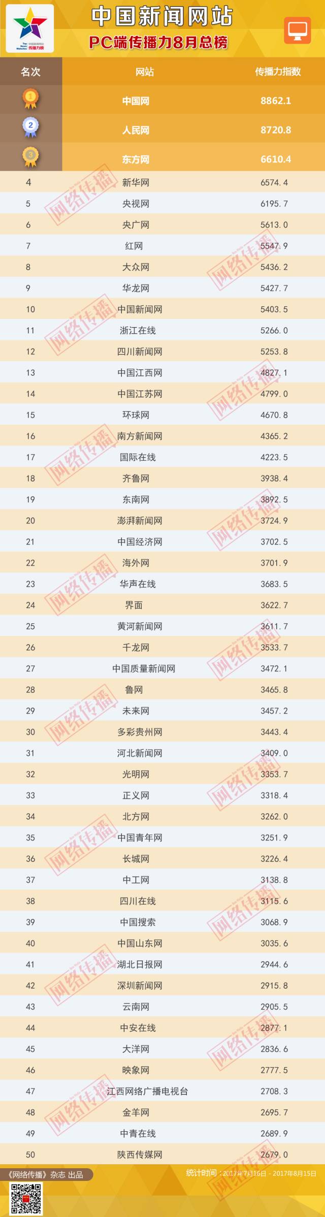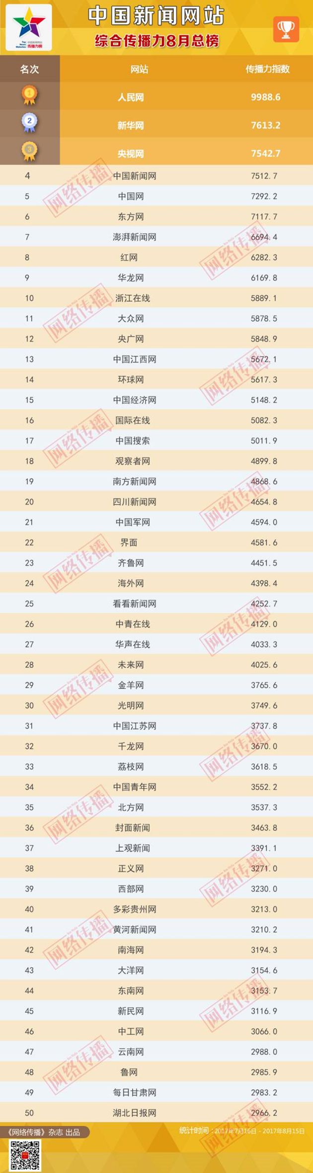 中國新聞網(wǎng)站傳播力2017年8月總榜