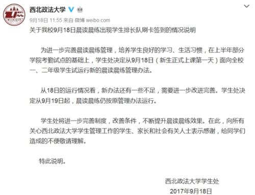 有媒體報道,9月18日一早,西北政法大學學生們為晨讀打卡排起了長長的隊伍。部分同學表示,幾千學生,就4個打卡機能用,“成功刷臉完成晨讀堪比春運搶火車票!”當日中午,學校官方微博就此事發布通告稱,新的刷臉打卡的方式還存在不足,將于19日起恢復原管理辦法。