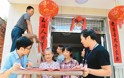 圖為9月21日,在福建省寧德市古田縣鳳埔鄉造福工程集中安置點,鄉干部黃東華(左一)和喜遷新居的林光鍋一家共同貼上喜慶的門聯。