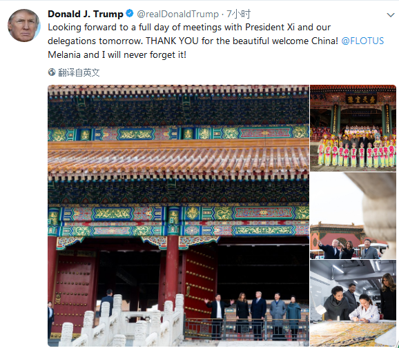 特朗普在社交媒體上發布了幾張在故宮博物院參觀時的照片,并寫道,“我非常期待明天與習近平主席以及我們的代表團進行的全天會談。中國,謝謝你的盛大歡迎!我和梅拉尼亞都不會忘記的!”